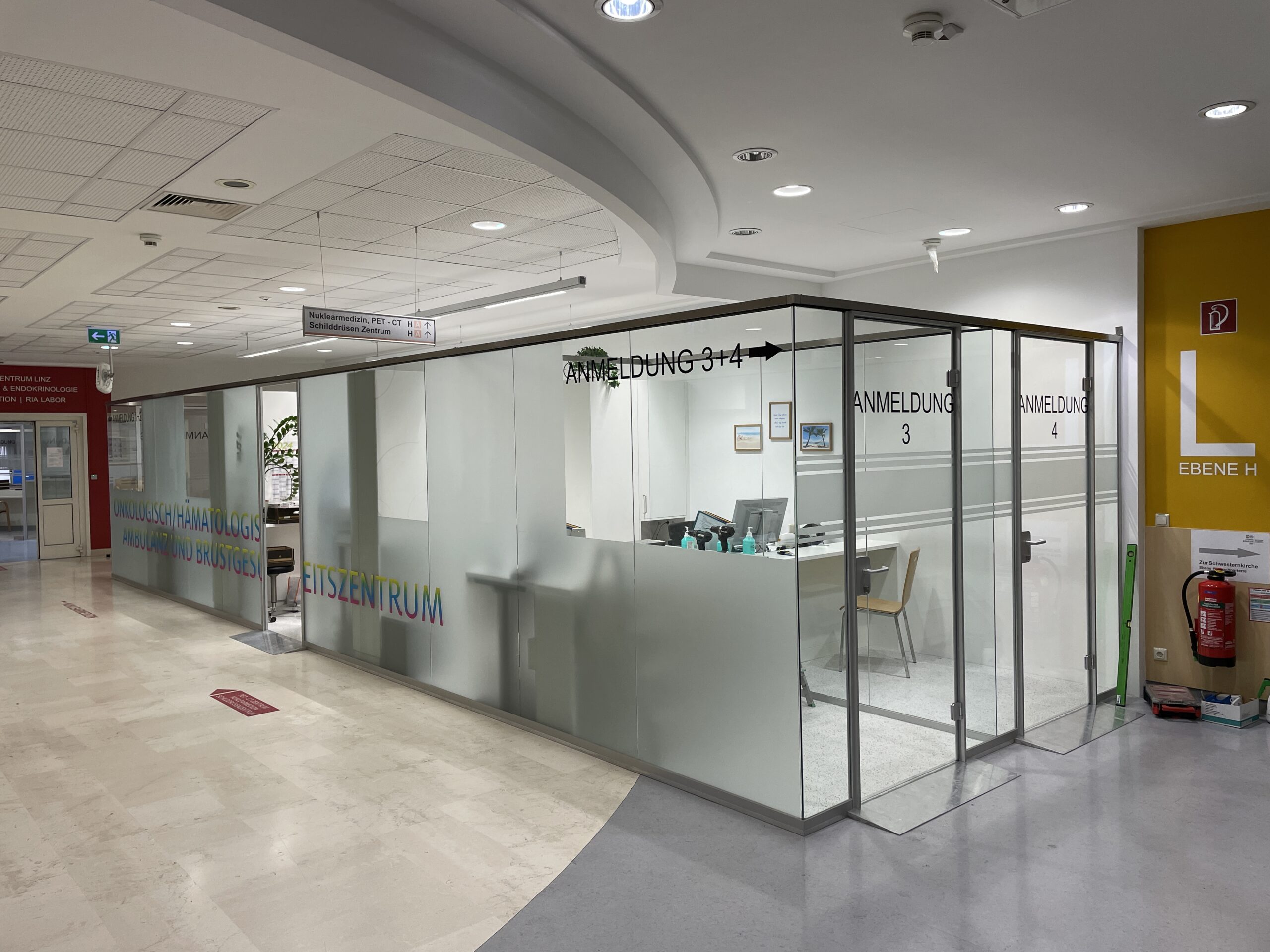 Um Platz dafür zu schaffen, wird die Anmeldung der Onkologischen Tagesklinik in das Hochparterre verlegt und ist ab 8. November 2024 dort in Betrieb.