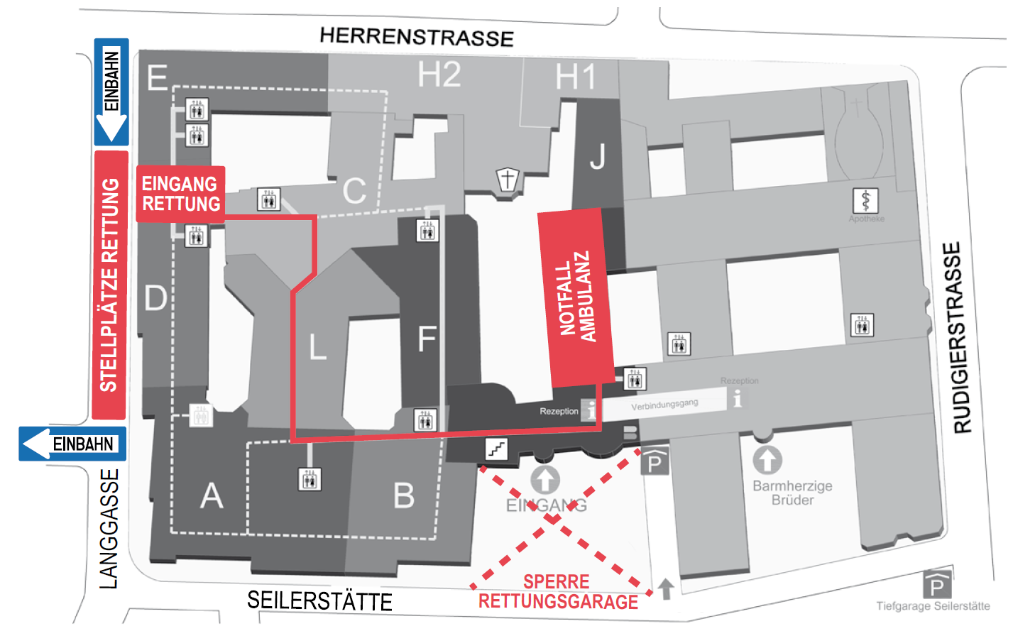 Ab Montag, 18. November 2024, ist die Rettungsgarage im Ordensklinikum Linz Barmherzige Schwestern aufgrund von Bauarbeiten für rund zwei Jahre gesperrt. Für den Krankentransport und den Rettungsdienst steht in dieser Zeit ein provisorischer Rettungseingang mit überdachten Stellplätzen in der Langgasse zur Verfügung. Da die Zufahrt über die Herrenstraße erfolgt, wurde die Einbahn in der Langgasse umgedreht.