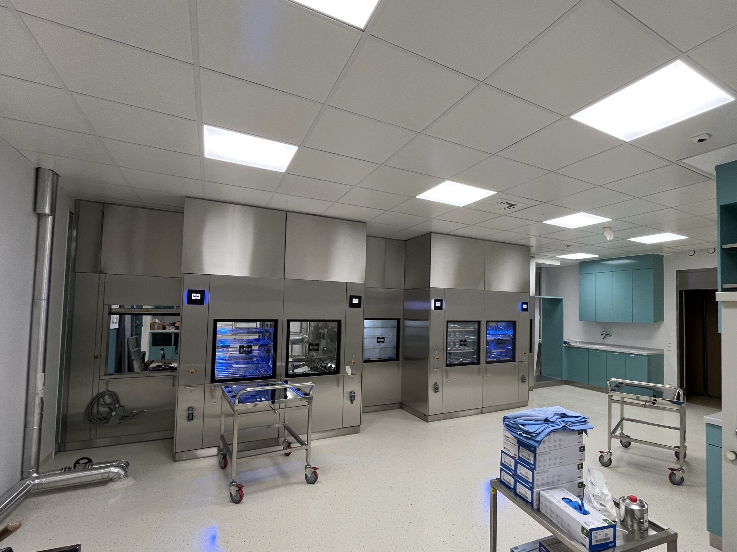 Zwischen Juli und Oktober 2025 wurde die AEMP (Aufbereitungseinheit für Medizinprodukte) im 1. Obergeschoss des Zentral-OPs umfassend umgebaut und technisch erneuert. Ziel war es, eine moderne Infrastruktur zu schaffen, die den steigenden Anforderungen gerecht wird und eine zuverlässige Versorgung des OP-Bereichs mit aufbereiteten Medizinprodukten sicherstellt.